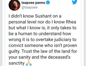दरअसल, तापसी ने अपने इस ट्वीट में रिया चक्रवर्ती का सपोर्ट किया है. उन्होंने ट्वीट करते हुए लिखा, ‘व्यक्तिगत तौर पर मैं न तो सुशांत को जानती हूं और न ही रिया को, लेकिन इतना जरूर जानती हूं कि न्यायपालिका से पहले किसी को दोषी साबित करना गलत है. कानून पर विश्वास करो.’